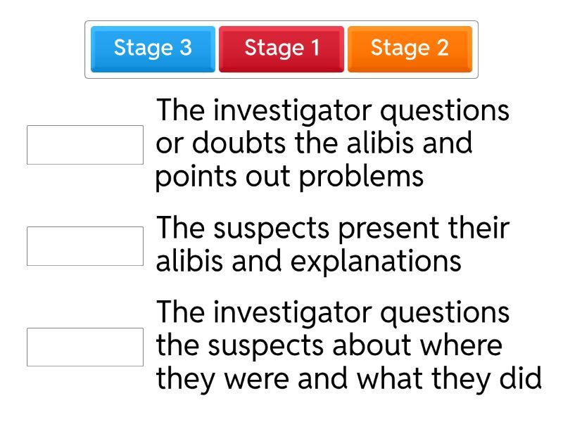 Stage 1 - The investigator questions the suspects about where they were and what they did, Stage 2 - The suspects present their alibis and explanations, Stage 3 - The investigator questions or doubts the alibis and points out problems,