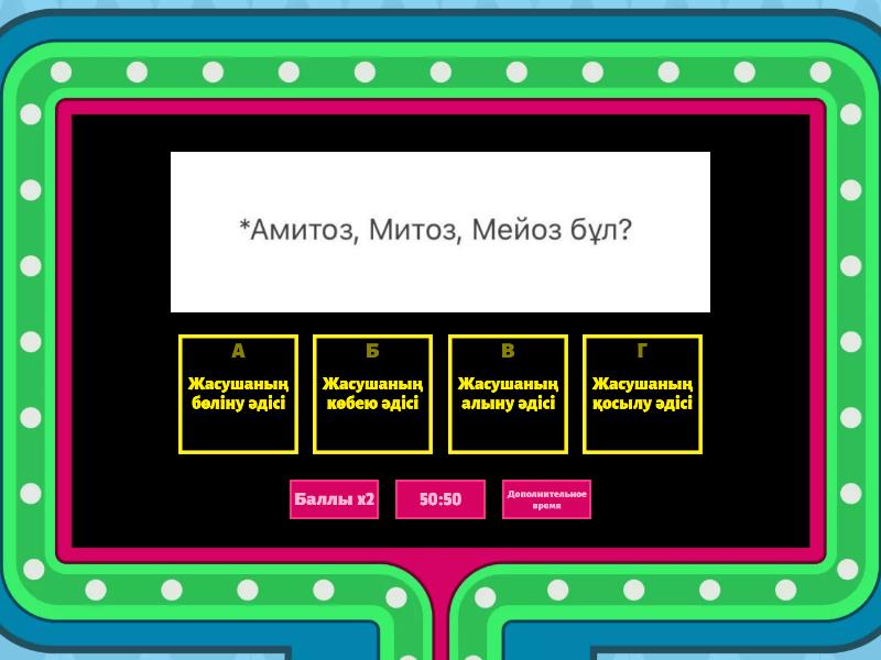 1) Митоз дегеніміз - a) Аналық жасушадан 4 жасушаның түзілу үдерісі b) Аналық жасушадан түзілген екі жас жасушанын хромосома саны озгеріссіз сол калпында сакталатын үдеріс c) Тікелей бөліну d) Үш қабатты ұрық 2) Мейоз дегеніміз - a) Аналық жасушадан 4 жасушаның түзілу үдерісі b) Аналық жасушадан түзілген екі жас жасушанын хромосома саны озгеріссіз сол калпында сакталатын үдеріс c) Тікелей бөліну d) Үш қабатты ұрық 3) Жыныссыз көбеюдің негізі a) Мейоз b) Амитоз c) Диплотена d) Митоз 4) Адам денесінің қай бөліктерінде митоз үздіксіз жүреді? a) Аяқ-қол b) Көз-мұрын c) шаш-тырнақ d) Құлақ, ерін 5) Екі ата-аналық даралардың қосылуы a) Гамета b) Гаметогенез c) Спермотогенез d) Зигота 6) Гамета дегеніміз - a) Хромосомалар жиынтығы гаплоидты болып келетін жыныс жасушалары b) Аталық гамета c) Голджи аппаратының өзгеріске ұшыраған түрі d) Жыныс жасушалары 7) Жасушалары гаплоидты хромосома болса, не үшін мейоз жолымен бөліне алмайды a) Хромосома санын одан әрі көбейте алмайды b) Хромосома санын одан әрі азайта алмайды c) Тек диплоидты болуы керек d) Спермотогенез түзіледі