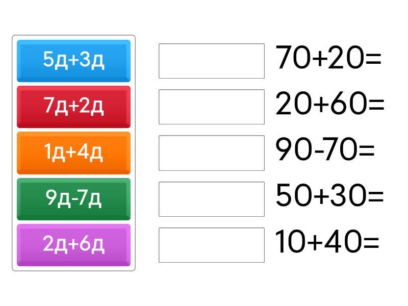 2д+6д - 20+60=, 7д+2д - 70+20=, 1д+4д - 10+40=, 9д-7д - 90-70=, 5д+3д - 50+30=,