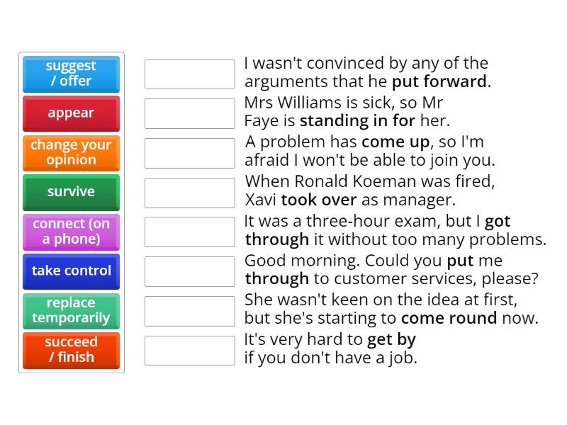 change your opinion - She wasn't keen on the idea at first, but she's starting to come round now., succeed / finish - It was a three-hour exam, but I got through it without too many problems., suggest / offer - I wasn't convinced by any of the arguments that he put forward., replace temporarily - Mrs Williams is sick, so Mr Faye is standing in for her., survive - It's very hard to get by if you don't have a job., appear - A problem has come up, so I'm afraid I won't be able to join you., connect (on a phone) - Good morning. Could you put me through to customer services, please?, take control - When Ronald Koeman was fired, Xavi took over as manager.,