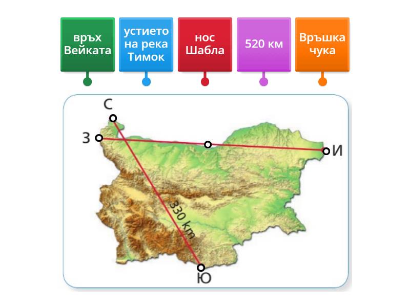устието на река Тимок, нос Шабла, Връшка чука, връх Вейката, 520 км.