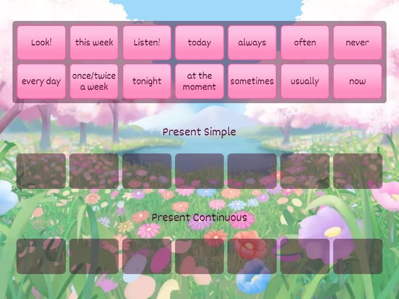 Present Simple: every day, once/twice a week, usually, never, often, always, sometimes, Present Continuous: now, at the moment, today, Look!, Listen!, this week, tonight,