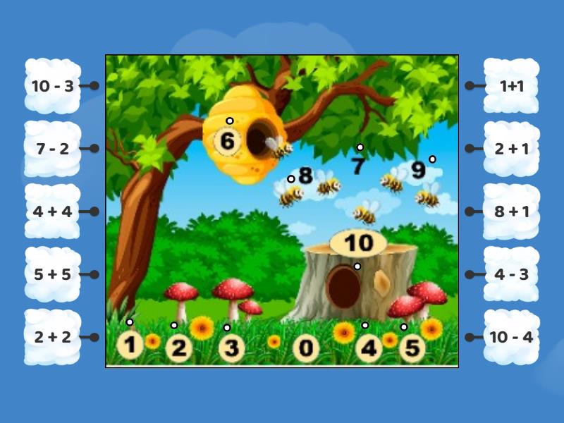 1+1 , 2 + 1, 2 + 2, 5 + 5, 4 - 3, 7 - 2, 10 - 4, 10 - 3, 8 + 1, 4 + 4.