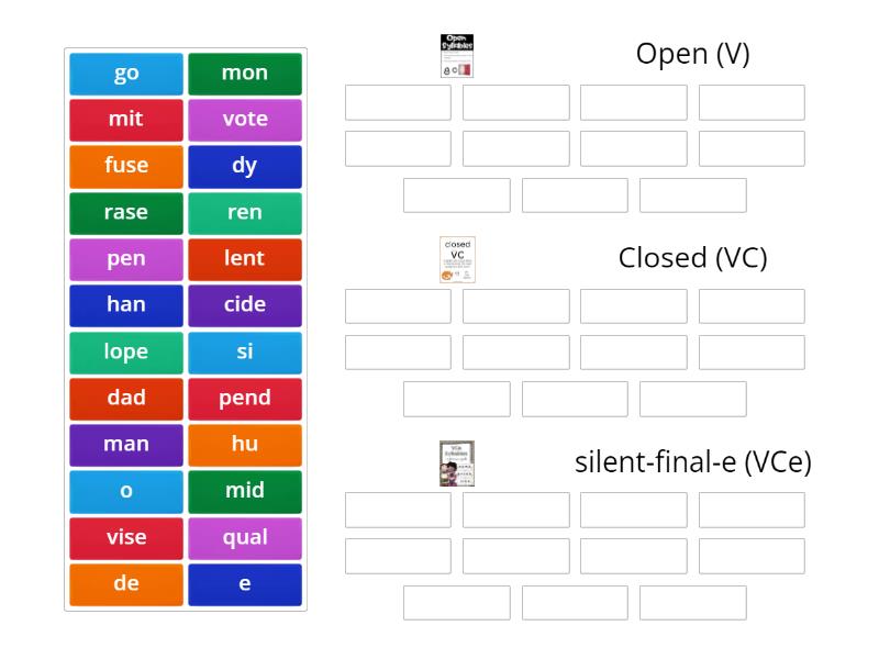 Open (V): dy, e, de, si, o, go, hu, Closed (VC): han, mon, ren, pend, qual, mid, mit, man, lent, pen, dad, silent-final-e (VCe): cide, lope, fuse, vote, rase, vise,