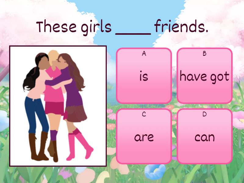 1) These girls ____ friends. a) is b) have got c) are d) can 2) Alena ____ my sister. a) am b) is c) has got d) can 3) She ____ a cat. a) is b) has got c) have got d) can 4) I ____ tired. a) am b) can c) have got d) are 5) The tigers ____ hungry. a) are b) is c) have got d) can 6) The hippos ______ small ears. a) has got b) have got c) are d) can 7) The birds ______ sing. a) can b) are c) has got 8) Masha ____ young. a) is b) are c) has got d) can 9) I ___  long hair. a) has got b) have got c) am 10) The frogs _____ jump. a) are b) have got c) can d) is 11) The monkey _____ a long tail. a) is b) have got c) has got d) can 12) We ___ from Russia. a) have got b) has got c) are d) is 13) They _____ run fast. a) have got b) can c) are d) has got 14) This spider ___ ugly. a) has got b) are c) is d) can 15) The spiders ______ eight legs.  a) have got b) is c) can d) has got 16) Elephants _____ walk fast. a) are b) have got c) can d) is 17) My friend ____ a big house. a) have got b) has got c) is d) can 18) You ____ beautiful. a) is b) are c) have d) can 19) The boys _____ bikes.  a) can b) are c) have got d) has got 20) They _____ ride a bike. a) are b) can c) have got d) has got