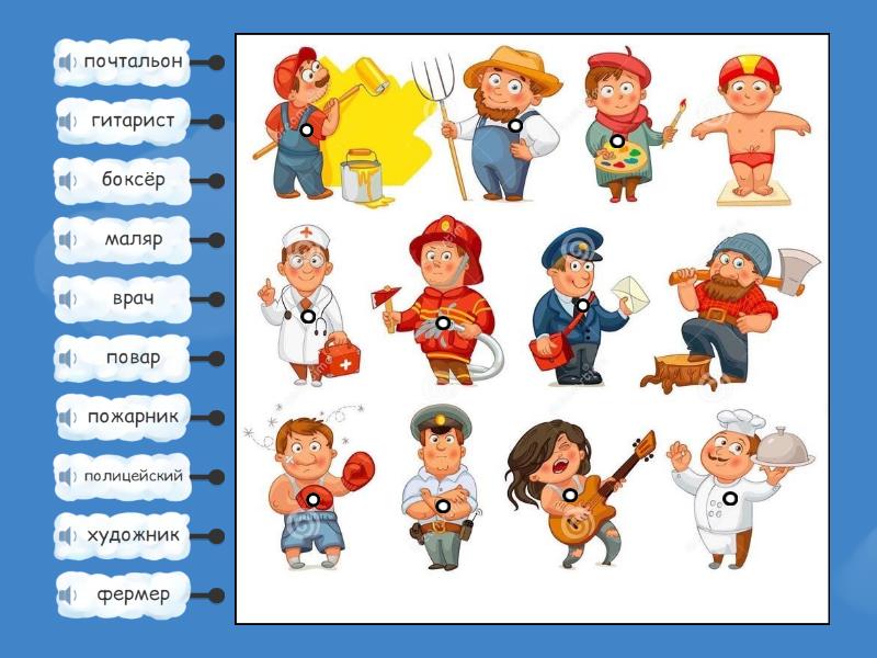 маляр, фермер, художник, врач, пожарник, почтальон, боксёр, гитарист, повар, полицейский.
