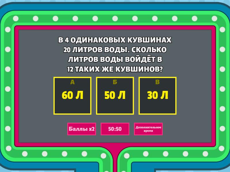 1) 10 ПРОСТЫХ КАРАНДАШЕЙ СТОЯТ 240 РУБЛЕЙ. СКОЛЬКО РУЧЕК МОЖНО КУПИТЬ НА ЭТУ СУММУ, ЕСЛИ ОДНА РУЧКА СТОИТ КАК ДВА КАРАНДАША? a) 5 b) 4 c) 6 2) ЗА 12 КГ ЯБЛОК ЗАПЛАТИЛИ 600 РУБЛЕЙ. СКОЛЬКО ДЕНЕГ ЗАПЛАТЯТ ЗА 10 КГ ГРУШ ПО ТОЙ ЖЕ ЦЕНЕ? a) 500 РУБ b) 600 РУБ c) 700 РУБ 3) ЗА 5 ЧАСОВ ЛЫЖНИК ПРОБЕЖАЛ 70 КМ, СКОЛЬКО ВРЕМЕНИ ЕМУ ПОТРЕБУЕТСЯ НА ДИСТАНЦИЮ 84 КМ? a) 6 ЧАС b) 3 ЧАС c) 12 ЧАС 4) В 4 ОДИНАКОВЫХ ПАКЕТАХ 12 КГ РИСА. СКОЛЬКО ТАКИХ ПАКЕТОВ ПОТРЕБУЕТСЯ ДЛЯ 30 КГ РИСА? a) 10 b) 9 c) 7 5) НА 5 ОДИНАКОВЫХ ПОЛКАХ 50 КНИГ. СКОЛЬКО ТАКИХ ПОЛОК ЗАЙМУТ 70 КНИГ? a) 7 b) 4 c) 8 6) В 4 ОДИНАКОВЫХ КУВШИНАХ 20 ЛИТРОВ ВОДЫ. СКОЛЬКО ЛИТРОВ ВОДЫ ВОЙДЁТ В 12 ТАКИХ ЖЕ КУВШИНОВ? a) 60 Л b) 30 Л c) 50 Л 7) НА 3 ОДИНАКОВЫЕ НАВОЛОЧКИ ИДЁТ 6 М ТКАНИ, СКОЛЬКО МЕТРОВ ТКАНИ НУЖНО ДЛЯ 5 ПОДОДЕЯЛЬНИКОВ, ЕСЛИ НА ОДИН ПОДОДЕЯЛЬНИК ИДЁТ В 3 РАЗА БОЛЬШЕ ТКАНИ, ЧЕМ НА НАВОЛОЧКУ? НАВОЛОЧКИ? a) 30 М b) 60 М. c) 35 М.