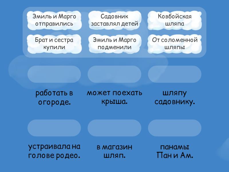 Эмиль и Марго отправились - в магазин шляп. , Садовник заставлял детей - работать в огороде., Ковбойская шляпа - устраивала на голове родео., Брат и сестра купили - панамы Пан и Ам., От соломенной шляпы - может поехать крыша. , Эмиль и Марго подменили - шляпу садовнику.,