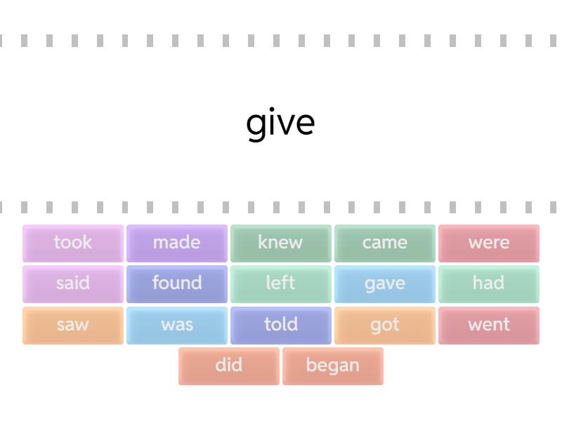 gave - give, went - go, saw - see, came - come, said - say, told - tell, had - have, did - do, made - make, was - is, am, were - are, got - get, knew - know, took - take, found - find, left - leave, began - begin,