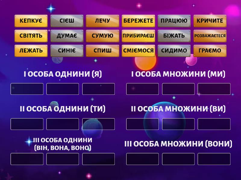 І ОСОБА ОДНИНИ (Я): ЛЕЧУ, СУМУЮ, ПРАЦЮЮ, І ОСОБА МНОЖИНИ (МИ): СМІЄМОСЯ, ГРАЄМО, СИДИМО, ІІ ОСОБА ОДНИНИ (ТИ): СІЄШ, ПРИБИРАЄШ, СПИШ, ІІ ОСОБА МНОЖИНИ (ВИ): КРИЧИТЕ, РОЗВАЖАЄТЕСЯ, БЕРЕЖЕТЕ, ІІІ ОСОБА ОДНИНИ (ВІН, ВОНА, ВОНО): СИНІЄ, КЕПКУЄ, ДУМАЄ, ІІІ ОСОБА МНОЖИНИ (ВОНИ): БІЖАТЬ, ЛЕЖАТЬ, СВІТЯТЬ,