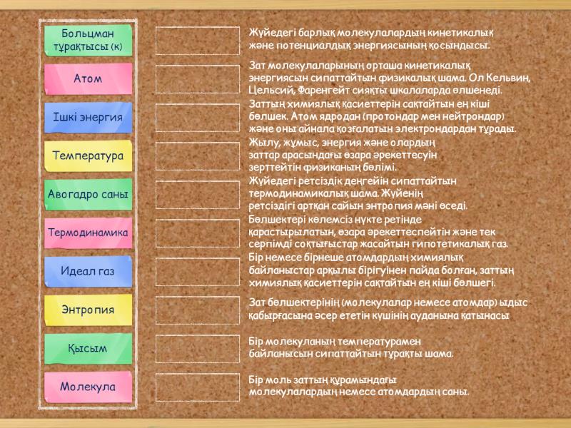 Молекула - Бір немесе бірнеше атомдардың химиялық байланыстар арқылы бірігуінен пайда болған, заттың химиялық қасиеттерін сақтайтын ең кіші бөлшегі. , Атом - Заттың химиялық қасиеттерін сақтайтын ең кіші бөлшек. Атом ядродан (протондар мен нейтрондар) және оны айнала қозғалатын электрондардан тұрады., Температура - Зат молекулаларының орташа кинетикалық энергиясын сипаттайтын физикалық шама. Ол Кельвин, Цельсий, Фаренгейт сияқты шкалаларда өлшенеді., Қысым - Зат бөлшектерінің (молекулалар немесе атомдар) ыдыс қабырғасына әсер ететін күшінің ауданына қатынасы, Идеал газ - Бөлшектері көлемсіз нүкте ретінде қарастырылатын, өзара әрекеттеспейтін және тек серпімді соқтығыстар жасайтын гипотетикалық газ., Термодинамика - Жылу, жұмыс, энергия және олардың заттар арасындағы өзара әрекеттесуін зерттейтін физиканың бөлімі., Больцман тұрақтысы (к) - Бір молекуланың температурамен байланысын сипаттайтын тұрақты шама., Авогадро саны - Бір моль заттың құрамындағы молекулалардың немесе атомдардың саны.​, Ішкі энергия - Жүйедегі барлық молекулалардың кинетикалық және потенциалдық энергиясының қосындысы., Энтропия - Жүйедегі ретсіздік деңгейін сипаттайтын термодинамикалық шама. Жүйенің ретсіздігі артқан сайын энтропия мәні өседі.,