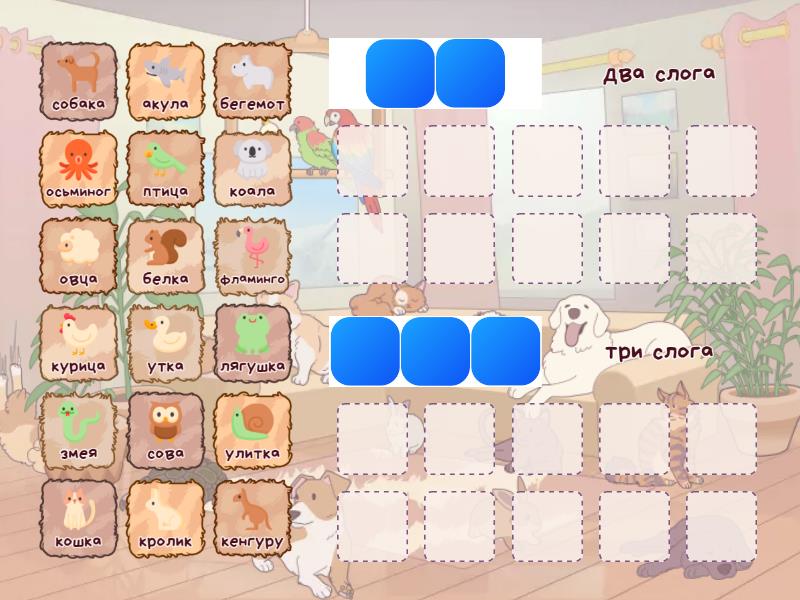 два слога: кошка, овца, утка, змея, птица, кролик, белка, сова, три слога: собака, улитка, курица, лягушка, осьминог, фламинго, бегемот, кенгуру, акула, коала,