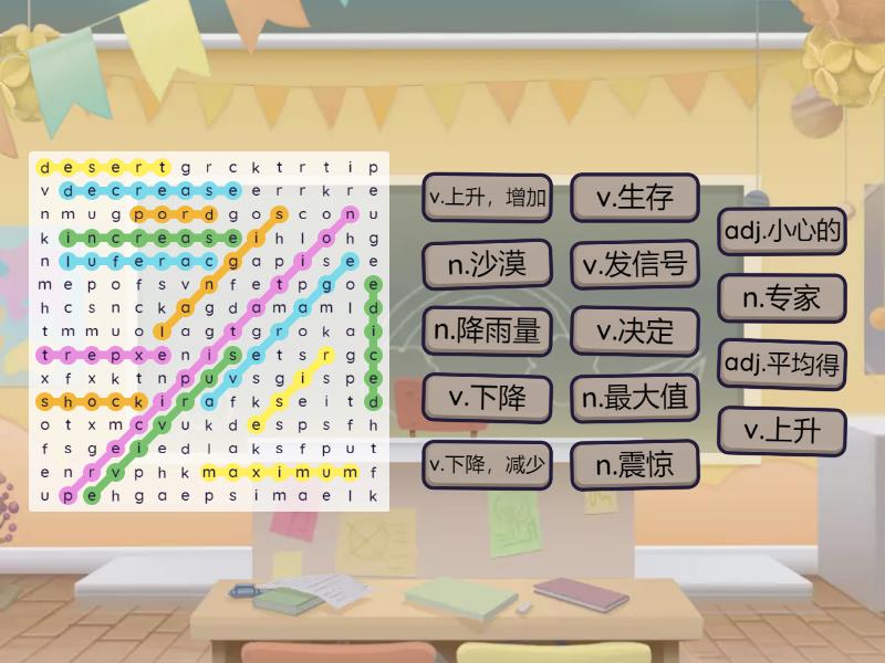 shock - n.震惊, rise - v.上升, decide - v.决定, careful - adj.小心的, precipitation - n.降雨量, drop - v.下降, desert - n.沙漠, survive - v.生存, average - adj.平均得, expert - n.专家, signal - v.发信号, maximum - n.最大值, increase - v.上升,增加, decrease - v.下降,减少,