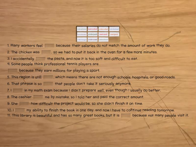 1. Many workers feel ____ because their salaries do not match the amount of work they do. 2. The chicken was ____, so we had to put it back in the oven for a few more minutes. 3. I accidentally ____ the pasta, and now it is too soft and difficult to eat. 4. Some people think professional tennis players are ____ because they earn millions for playing a sport. 5. This region is still ____, which means there are not enough schools, hospitals, or good roads. 6. That phrase is so ____ that people don’t take it seriously anymore. 7. I ____ in my math exam because I didn’t prepare well, even though I usually do better. 8. The cashier ____ me by mistake, so I told her and paid the correct amount. 9. She ____ how difficult the project would be, so she didn’t finish it on time. 10. I ____ my ability to finish the book in one day, and now I have to continue reading tomorrow. 11. This library is beautiful and has so many great books, but it is ____ because not many people visit it.
