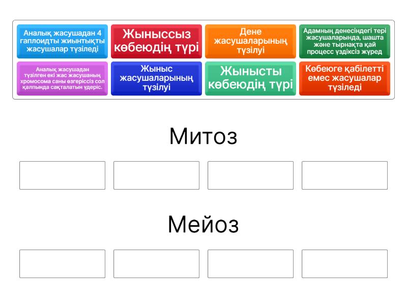 Митоз: Жыныссыз көбеюдің түрі, Аналық жасушадан түзілген екі жас жасушаның хромосома саны өзгеріссіз сол қалпында сақталатын үдеріс., Адамның денесіндегі тері жасушаларында, шашта және тырнақта қай процесс үздіксіз жүред, Дене жасушаларының түзілуі, Мейоз: Жынысты көбеюдің түрі, Аналық жасушадан 4 гаплоидты жиынтықты жасушалар түзіледі, Көбеюге қабілетті емес жасушалар түзіледі, Жыныс жасушаларының түзілуі,