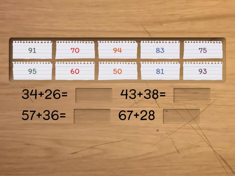 34+26= ____ 43+38= ____ 57+36= ____ 67+28 ____ 56-24= ____ 82-43= ____ 61-47= ____ 74-58 ____ 85-46= ____ 55+37= ____ 26+59= ____ 100-47= ____