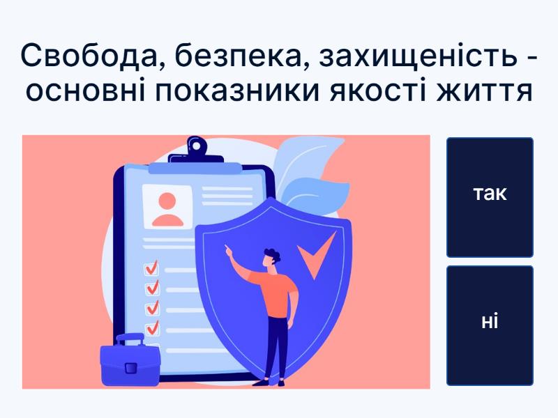 1) Свобода, безпека, захищеність - основні показники якості життя a) так b) ні 2) Захист території і населення країни від зовнішніх загроз a) політична безпека b) воєнна безпека c) економічна безпека d) інформаційна безпека 3) Захист природного середовища та збереження його ресурсів a) продовольча безпека b) економічна безпека c) екологічна безпека d) соціальна безпека 4) Захист прав людини, підтримка культурного розвитку a) продовольча безпека b) соціальна безпека c) гуманітарна безпека d) інформаційна безпека 5) Надзвичайні ситуації можуть погіршити стан довкілля a) так b) ні 6) Основний принцип безпеки життєдіяльності: передбачати, уникати, діяти a) так b) ні 7) Будь-яку інформацію необхідно критично оцінювати a) так b) ні