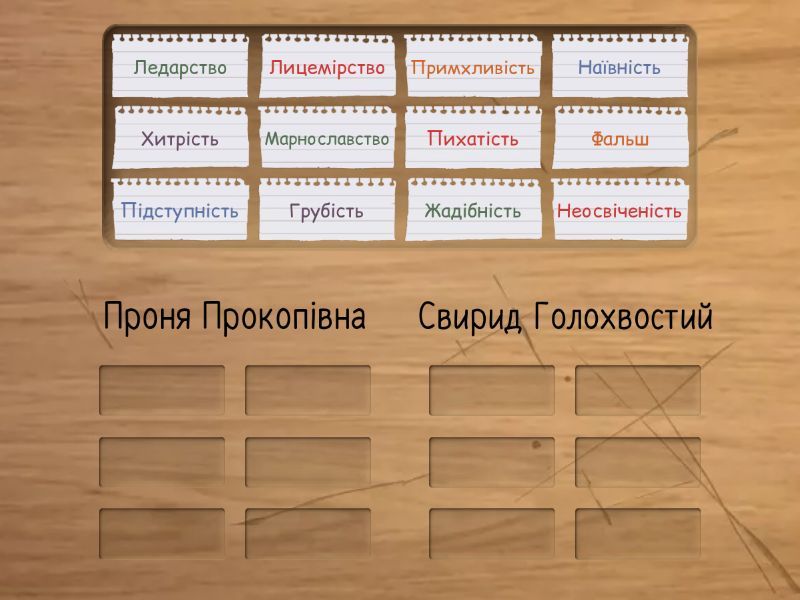 Проня Прокопівна: Примхливість, Неосвіченість, Пихатість, Марнославство, Грубість, Наївність, Свирид Голохвостий: Хитрість, Жадібність, Лицемірство, Ледарство, Підступність, Фальш,
