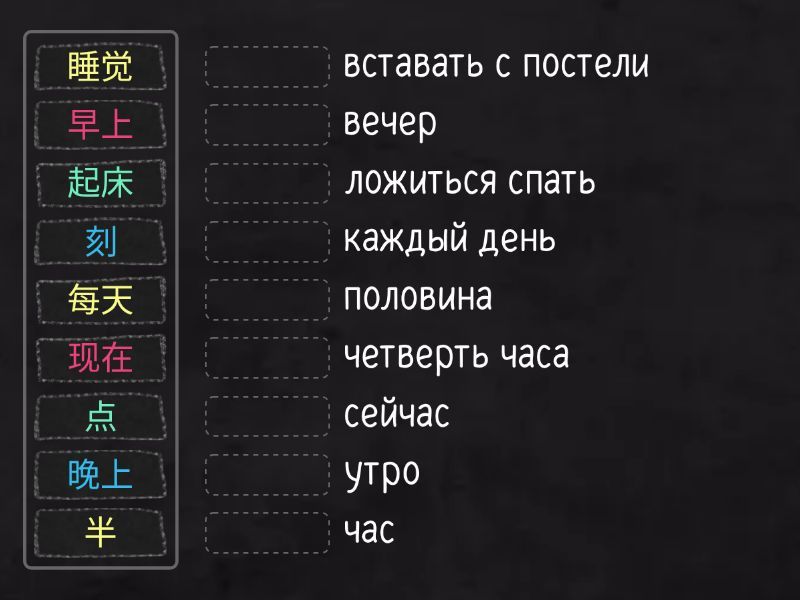 每天 - каждый день, 早上 - утро, 刻 - четверть часа, 晚上 - вечер, 睡觉 - ложиться спать, 现在 - сейчас, 点 - час, 半 - половина, 起床 - вставать с постели,