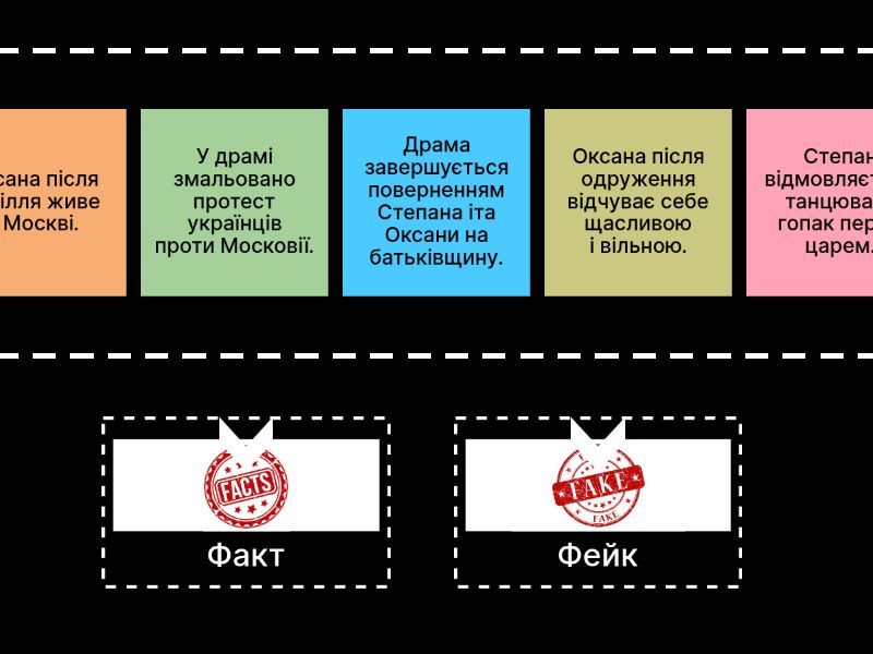 Факт: Події драми відбуваються в часи Руїни. , Оксана після весілля живе в Москві. , У драмі змальовано протест українців проти Московії., Твір має антиколоніальний зміст. , Образ Оксани у драмі символізує поневолену Україну. , Леся Українка у творі засуджує пристосуванство та зраду національних ідеалів., Фейк: Степан — український козак, що воює з московськими боярами. , Степан — сміливий і незалежний герой, який протестує проти царської влади. , Оксана після одруження відчуває себе щасливою і вільною. , Матір Степана підтримує Оксану і поділяє її тугу за Україною. , Драма завершується поверненням Степана іта Оксани на батьківщину., Степан відмовляється танцювати гопак перед царем.,