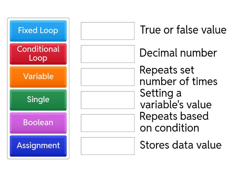 Fixed Loop - Repeats set number of times, Conditional Loop - Repeats based on condition, Running Total - Sum of values, Internal Commentary - Programmer's notes in code, Variable - Stores data value, Boolean - True or false value, String - Sequence of characters, Integer - Whole number, Single - Decimal number, Concatenation - Joining strings together, Assignment - Setting a variable's value,