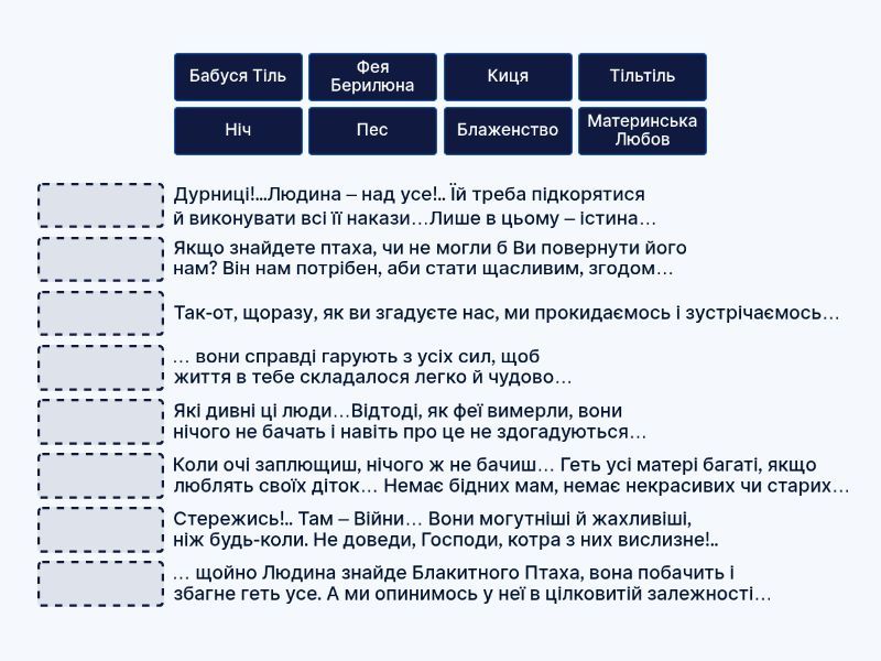 Фея Берилюна - Які дивні ці люди…Відтоді, як феї вимерли, вони нічого не бачать і навіть про це не здогадуються…, Киця - … щойно Людина знайде Блакитного Птаха, вона побачить і збагне геть усе. А ми опинимось у неї в цілковитій залежності…, Пес - Дурниці!...Людина – над усе!.. Їй треба підкорятися й виконувати всі її накази…Лише в цьому – істина… , Бабуся Тіль - Так-от, щоразу, як ви згадуєте нас, ми прокидаємось і зустрічаємось… , Ніч - Стережись!.. Там – Війни… Вони могутніші й жахливіші, ніж будь-коли. Не доведи, Господи, котра з них вислизне!.., Блаженство - … вони справді гарують з усіх сил, щоб життя в тебе складалося легко й чудово…, Материнська Любов - Коли очі заплющиш, нічого ж не бачиш… Геть усі матері багаті, якщо люблять своїх діток… Немає бідних мам, немає некрасивих чи старих…, Тільтіль - Якщо знайдете птаха, чи не могли б Ви повернути його нам? Він нам потрібен, аби стати щасливим, згодом…,