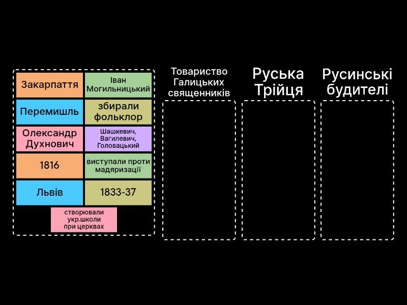 Товариство Галицьких священників: Іван Могильницький, Перемишль, 1816, створювали укр.школи при церквах, Руська Трійця: Шашкевич, Вагилевич, Головацький, Львів, 1833-37, збирали фольклор, Русинські будителі: Олександр Духнович, Закарпаття, виступали проти мадяризації,