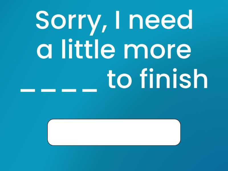 Nice ___ meet you!, See ___ next Tuesday, Sorry for ____ late, How do you say “здание” ___ English?, What ____ it mean?, ___ do you spell “queue”?, What page are we ___ ?, Sorry, could you repeat, ____ ?, Sorry, I ____ understand., Sorry, I need a little more ____ to finish, I ___ help with exercise 11, Could you help ___?, I've finished = I'm ___.