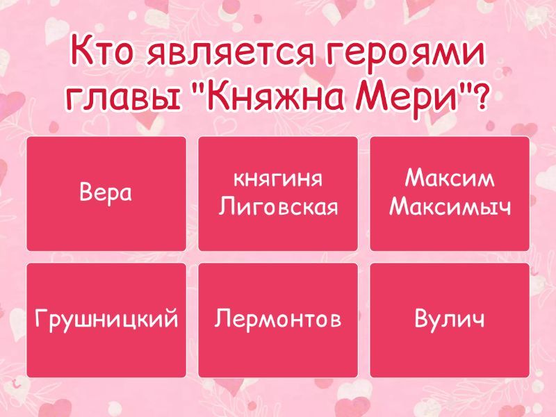 1) Кто является героями главы "Княжна Мери"? a) Вера b) княгиня Лиговская c) Максим Максимыч d) Грушницкий e) Лермонтов f) Вулич 2) Какая основная проблема раскрывается в главе «Княжна Мери»? a) Проблема власти и подчинения b) Конфликт отцов и детей c) Противоречие между чувством и разумом d) Проблема конфликта поколений 3) Где происходит действие главы "Княжна Мери"? a) Кисловодск b) Пятигорск c) Петербург d) Ялта 4) Чье это описание "Он довольно остер: эпиграммы его часто забавны, но никогда не бывают метки и злы: он никого не убьет одним словом; он не знает людей и их слабых струн, потому что занимался целую жизнь одним собою. Его цель — сделаться героем романа". a) Грущницкий b) Печорин c) Князь Лиговской d) Муж Веры 5) Чье это описание : «блондинка, с правильными чертами» и родинкой на щеке" a) Вера b) княгиня Лиговская c) Мери d) ундина 6) Почему любовь Печорина никому не принесла счастья? a) он ничем не жертвовал для тех, кого любил, b) он всех считал ниже себя, недостойными его любви c) он никого не любил d) он понимал, что полюбив, потеряет себя 7) Какой нравственный смысл имеет конфликт Печорина с Грушницким? a) Показать трагедию дружбы b) Показать бессмысленность светского флирта c) Показать борьбу за честь и достоинство d) Показать разрушительную силу зависти и фальши 8) Какое событие происходит в конце главы "Княжна Мери"? a) Дуэль b) Свадьба c) Путешествие d) Разлука 9) Что двигало Печориным, когда он поехал вслед за Верой? a) чувство вины b) хотел удостовериться в ее любви c) он хотел вернуть ей письмо d) он понял, что Вера была единственной женщиной, которую он любил по-настоящему 10) Чьи это слова "Я давно уж живу не сердцем, а головою"? a) Вернера b) Печорина c) Веры d) Грушницкого