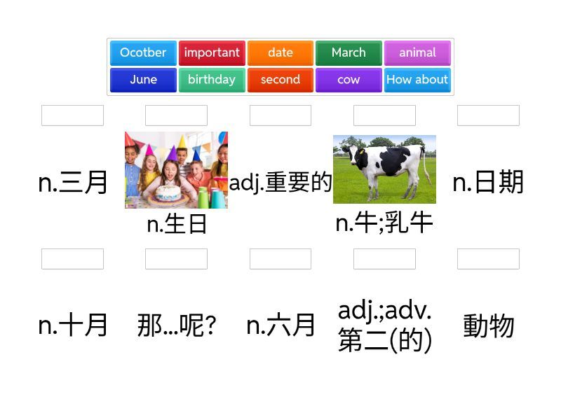 date - n.日期, November - n.十一月, first - adj.;adv. 第一(的), second - adj.;adv. 第二(的), third - adj.;adv. 第三(的), Thanksgiving - n.感恩節, important - adj.重要的, holiday - n.節日;假日, when - adv.何時, birthday - n.生日, also - adv.也;此外, before - prep.在..之前, around - adv.; prep. 圍繞;在...附近, How about - 那...呢?, next - adj.下一個的, month - n.月份, January - n.一月, February - n.二月, March - n.三月, April - n.四月, May - n.五月, June - n.六月, July - n.七月, August - n.八月, September - n.九月, Ocotber - n.十月, December - n.十二月, animal - 動物, cow - n.牛;乳牛, dinner - n.晚餐,