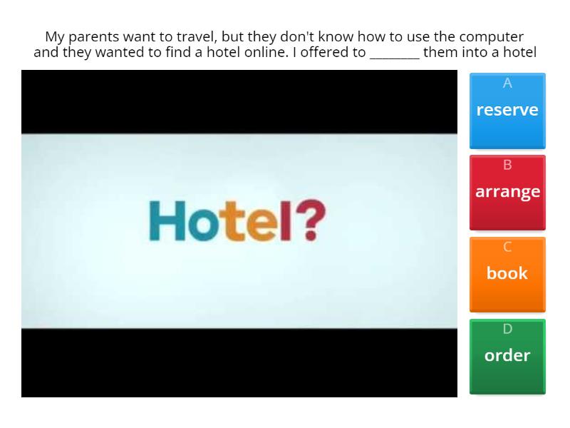 1) My parents want to travel, but they don't know how to use the computer and they wanted to find a hotel online. I offered to ________ them into a hotel a) reserve b) arrange c) book d) order 2) When schools _________ for Easter holidays in the UK, families tend to go on holiday. a) break up b) break down c) break away d) break through 3) While I was driving along the road, my car ___________ and I had to call the mechanic. a) broke up b) broke down c) broke away d) broke through 4) Going out with Suzie is a bit boring. She always _________ her health problems and it's the only thing she talks about. a) brings down b) comes up with c) brings up d) comes across 5) He was ill for six weeks and _____ behind with his schoolwork. He should work as hard as he can to keep up with the rest of the students. a) was b) kept c) stayed d) fell 6) We walked to the next beach to get __________ from the crowds. Having so many people around is so frustrating. a) up b) around c) away d) about 7) "USA" __________ for the United States of America. a) means b) stands c) is d) defines 8) It's very late and you have had a lot to drink. Why don't you ________ and drive back to your house in the morning? a) stay up b) stay over c) stay back d) stay away 9) I wasn't keen on going out last weekend, but my friend Mary managed to talk me _______ going along. a) about b) for c) through d) into 10) I wanted to know what his opinion about the movie was, but he avoided answering. After a while, he _________ to having slept through most of the movie and of course he didn't know what had happened! a) confessed b) acknowledged c) declared d) denied 11) Make sure you heat that food ______ before you eat it. It tastes awful when it's eaten cold. a) in b) up c) down d) off 12) My brother is _________ to technology. He spends all day texting his friends, playing computer games and listening to music on his MP3 player. a) addicted b) obsessed c) dependent d) indifferent 13) She _________ a lot of beautiful photographs on her last holiday. She is very good at photography! a) made b) did c) caught d) took 14) Dr Joseph Bell was a distinguished Scottish doctor and professor at Edinburgh University in the ____________ nineteenth century. a) late b) previous c) closing d) final e) end 15) Researchers in the agricultural study lived within communities. This 1 ____________ them to learn the techniques used by the women from the indigenous communities in a very 2 __________ space of time. a) 1 enabled 2 short b) 1 authorized  2 narrow c) 1 guaranteed 2 rapid d) 1 caused 2 small 16) My uncle can 1 ____________ a person's occupation from marks on their hand. He is also able to 2 __________ a soldier from a sailor just from the way they moved. a) 1 relate 2 change b) 1 acknowledge  2 differ c) 1 solve 2 contrast d) 1 determine 2 distinguish 17) He was good at _____________ where his students were from by identifying small differences in their accents. a) showing off b) working out c) setting down d) turning up 18) Dr Bell's skills for observation and deduction ____________ a great impression on his students, particularly on one called Arthur Conan Doyle. a) set b) formed c) put d) made