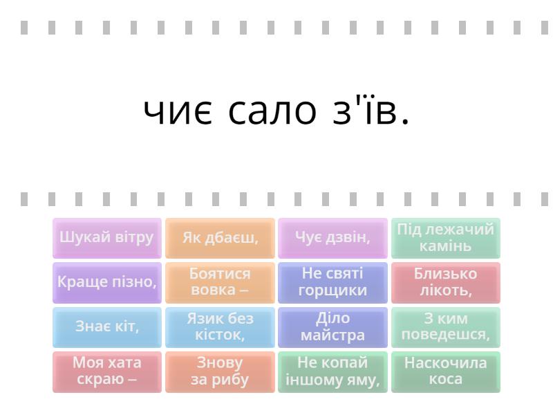 Знає кіт, - чиє сало з'їв., Близько лікоть, - та не скуштуєш., Боятися вовка – - до лісу не ходити., Не копай іншому яму, - бо сам упадеш., Чує дзвін, - та не знає, звідки він., Діло майстра - величає., З ким поведешся, - того й наберешся., Знову за рибу - гроші., Краще пізно, - як ніколи., Язик без кісток, - що хоче лопоче., Моя хата скраю – - нічого не знаю., Як дбаєш, - так і маєш., Наскочила коса - на камінь., Шукай вітру - в полі., Не святі горщики - ліплять., Під лежачий камінь - вода не тече.,