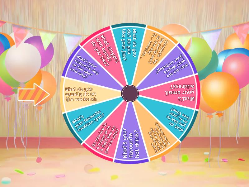 1) What's your favourite day of the year and why? 2) What singers and bands do you like? 3) What do you do?  Do you like your job? 4) Complete "My favourite part of the day is... because... 5) How old are you? When's your birthday? 6) What's your email address? 7) What do you like to do in your free time? 8) Do you like watching series? Are you watching one at the moment? 9) What's your favourite hot drink? 10) Do you live in a house or in a flat? Who do you live with? 11) What's your favourite vacation spot? 12) What do you usually do on the weekend?