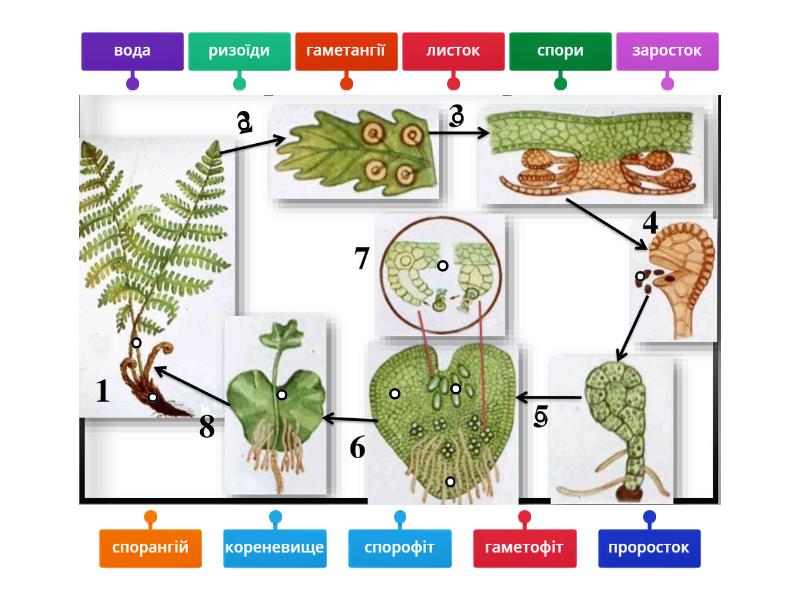 кореневище , листок , спорангій , спори , заросток , проросток , ризоїди , гаметангії , вода , спорофіт , гаметофіт .