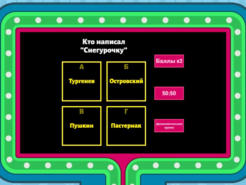 1) Кто написал "Снегурочку" a) Тургенев b) Островский c) Пушкин d) Пастернак 2) в каком году родился Гофман a) 1776 b) 1775 c) 1777 d) 1778 3) Что обозначает слово "кутья" a) блины b) каша c) мед d) шапка 4) В произведений "Ночь перед рождеством" сколько лет Оксане a) 17 b) 14 c) 28 d) 20 5) В произведений "Ночь перед рождеством" как звали маму кузнеца a) Оксана b) Солоха c) Татьяна d) Саша 6) Назовите имя русского баснописца: a) Ломоносов b) Жуковский c) Дмитриев d) Карамзин 7) «Дубровский» Пушкина – это: a) Это повесть b) Это рассказ c) Это роман d) Это новелла 8) Главная идея «Записок охотника» Тургенева: a) Изображение жизни помещиков b) Борьба против крепостного права c) Изображение жизни крестьян d) Изображение жизни России Х1Хвека. 9) От лица какого персонажа ведется повествование в «Записках охотника»: a) От лица самого Тургенева b) От лица крестьян c) От лица охотника d) От лица помещиков. 10) Назовите главных героев рассказа «Бежин луг»: a) Автор, который повествует о событиях b) Взрослые крепостные крестьяне c) Крестьянские дети d) Помещики 11) Сколько мальчиков участвуют в повествовании рассказа «Бежин луг»: a) 2 b) 4 c) 5 d) 6 12) Кто автор рассказа «Конь с розовой гривой»: a) Пришвин b) Платонов c) Распутин d) Астафьев 13) Сколько подвигов совершил Геракл: a) 11 b) 8 c) 9 d) 12 14) Кто автор «Илиады» и «Одиссеи»: a) Гомер b) Софокл c) Еврипид d) Аристофан 15) Фольклор - это: a) Устное народное творчество b) Художественная литература c) Жанр литературы d) Жанр народного творчества 16) Заткнуть за пояс: a) Это пословица b) Это поговорка c) Это афоризм d) Это крылатое выражение 17) Что выковали циклопы для Зевса? a) Трезубец b) Громы и молнии c) Крылатые сандалии 18) где живут греческие боги a) Олимп b) Афон c) Троя d) Афины 19) Что было написано на яблоке, из-за которого поссорились три богини — Гера, Афродита и Афина? a) Царице морской b) Величайшей c) Мудрейшей d) Прекраснейшей 20) Кто изображен на монете? a) Артемида b) Афина c) Елена d) Афродита 21) Кто построил все божественные дворцы? a) Гефест b) Зевс c) Геракл d) Персей 22) Кто написал "Муму" a) Тургенев b) Чехов c) Толстой d) Пушкин 23) К какому сословию принадлежит Герасим? a) Крестьяне b) Купцы c) Дворяне d) дворник 24) В каком городе происходит действие рассказа «Муму»? a) Петербург b) Москва c) Смоленск d) Сарыагач 25) Как Герасим встретил Муму? a) Он нашел её в заброшенном сарае b) Он спас её из реки c) Он нашел Муму в лесу d) Он нашел её в кухне 26) Кем служит Татьяна? a) Прачкой b) Кухаркой c) Гувернанткой d) Приживалкой 27) Какое блюдо Герасим заказывает для Муму в трактире перед тем, как утопить ее? a) Борщ с салом b) Щи с мясом c) Уху d) Бифштекс 28) Как называется местечко, в котором происходят события? a) Шпонька b) Турлово c) Диканька d) Сарыагач 29) На чём летает ведьма в повести? a) В ступе b) На вороне c) На метле d) на БМВ 30) Что должен подарить Вакула, чтобы красавица вышла за него замуж? a) Черевики царицы b) Кольцо с бриллиантом c) Жемчужное ожерелье d) Кроссовки