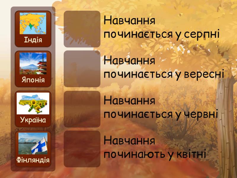 Індія - Навчання починається у червні, Японія - Навчання починають у квітні , Фінляндія - Навчання починається у серпні, Україна - Навчання починається у вересні,