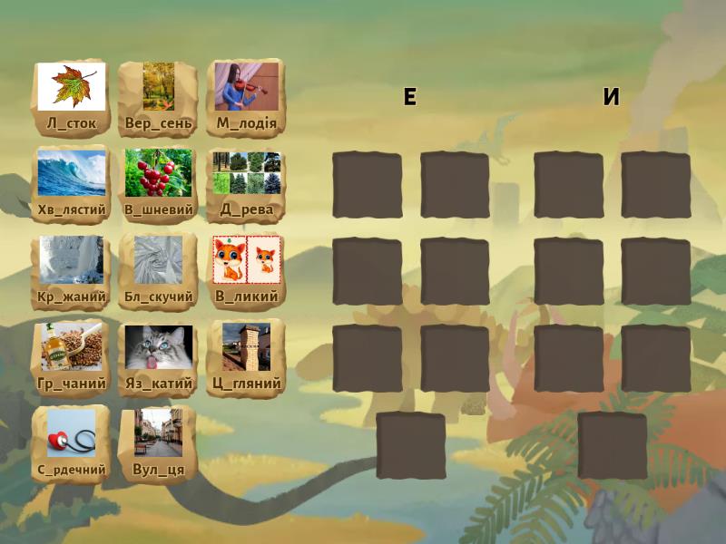 Е: С_рдечний, Д_рева, Гр_чаний, В_ликий, Вер_сень, Ц_гляний, М_лодія, И: Л_сток, Кр_жаний, Бл_скучий, Яз_катий, Хв_лястий, В_шневий, Вул_ця,