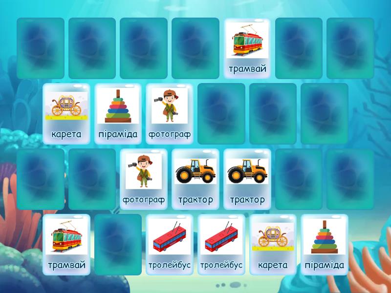 трактор, карета, піраміда, трамвай, тролейбус, фотограф, цирк, світлофор, динозавр, рамка, сковорода, майстер, трансформери,