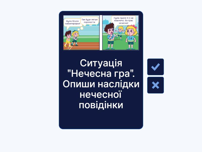 У шкільній їдальні вишикувалася довга черга за смаколиками. А Оленці так не хочеться чекати, бо треба ще встигнути погратися та поспілкуватися. Як має вчинити людина, яка поважає інших? - 1. Дотримуватись правил черги. 2. Ефективно використовувати час в черзі. 3. Розуміти важливість правил, Вадим нещодавно підстригся. Коли він прийшов у клас із новою зачіскою, інші діти стали дражнити його:«Чубатий, чубатий!». Як має відповісти Вадим? - 1. Я не чубатий, мене звати Вадим. 2. Моя зачіска - мій вибір., Ситуація "Найкращий малюнок". Опиши наслідки нечесної поведінки - 1. Втрата довіри. 2. Несправне досягнення. 3. Засудження оточуючих. 4. Втрачений шанс навчитися., Ситуація "Удавана хвороба". Опиши наслідки нечесної поведінки - 1. Втрачена можливість. 2. Негативні емоції. 3. Відсутність вирішення справжньої проблеми., Ситуація "Нечесна гра". Опиши наслідки нечесної повідінки - 1. Нечесність ізолює. 2. Тимчасова перевага. 3. Втрата репутації.,