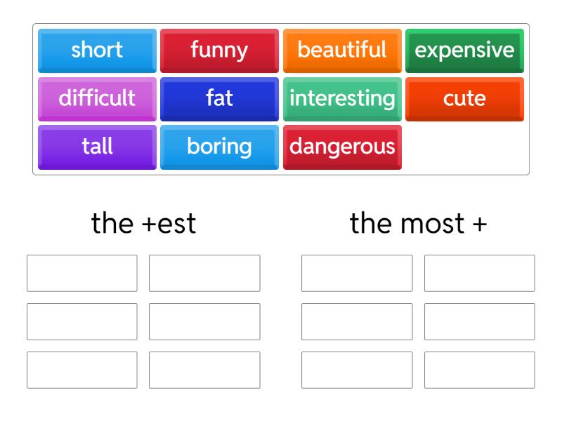 the +est: tall, fat, short, funny, cute, the most +: interesting, boring, expensive, difficult, dangerous, beautiful,