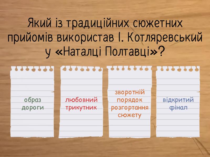 1) Який із традиційних сюжетних прийомів використав І. Котляревський у «Наталці Полтавці»? a) образ дороги b) любовний трикутник c) зворотній порядок розгортання сюжету d) відкритий фінал 2) Чим Горпина Терпилиха дорікає дочці Наталці? a) ледача і не веде господарство b) відмовляє всім женихам c) зрадила Петра d) пообіцяла вийти заміж за Возного 3) Як І. Котляревський зображує образи Возного і Виборного? a) як трагічні фігури b) як ідеальні персонажі c) як комічні образи, що втілюють негативні риси d) як героїв, що уособлюють абсолютне зло 4) Народний ідеал у п’єсі І. Котляревського «Наталка Полтавка» втілює… a) Наталка b) Терпилиха c) Виборний d) Возний 5) Хто промовляє слова: «Знайся кінь з конем, а віл з волом»? a) Наталка b) Терпилиха c) Виборний d) Петро 6) Хто сказав/сказала про себе: «Сирота - без роду, без племені, без талану і без приюту»? a) Виборний b) Петро c) Микола d) Наталка 7) Хто з героїв/героїнь п'єси сказав/сказала: «Брехати і обманювати других - од Бога гріх, а о людей сором»? a) Микола b) Петро c) Возний d) Виборний 8) Хто з дійових осіб твору говорить про голову героїню: «Ай, Наталка! Ай, Полтавка! От дівка, що й на краю пропасті не тільки не здригнулась, а й другого піддержує»? a) Тетерваковський b) Петро c) Макогоненко d) Микола 9) Хто вмовляє Наталку вийти заміж за возного? a) Виборний b) Микола c) Терпилиха d) Петро 10) Кульмінація п'єси розкривається в епізоді … a) Петро пропонує коханій усі зароблені ним гроші b) Наталка категорично відмовляється вийти заміж за возного c) Возний зрікається Наталки на користь Петра d) розмова матері з Наталкою 11) Хто з героїв «… пив, гуляв, а розвіявши добро, залишив дочку й жінку без куска хліба»? a) возний b) виборний c) Петро d) старий Терпило 12) У чому полягає новаторський характер п'єси «Наталка Полтавка»? (кілька відповідей) a) написана простою розмовною українською мовою b) герої - прості люди з народу c) події відбуваються протягом місяця d) герої поділяються на позитивних та негативних