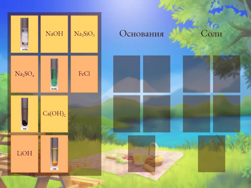 Основания: NaOH, LiOH, Ca(OH)2, , , Соли: Na2SO4, FeCl, Na2SiO3, , ,