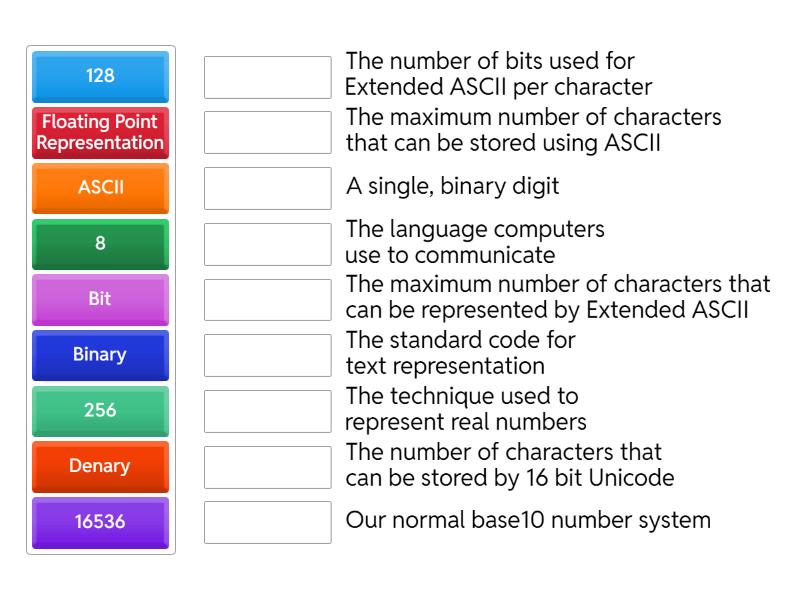 Bit - A single, binary digit, Binary - The language computers use to communicate, Denary - Our normal base10 number system, Floating Point Representation - The technique used to represent real numbers, ASCII - The standard code for text representation, 8 - The number of bits used for Extended ASCII per character, 256 - The maximum number of characters that can be represented by Extended ASCII, 128 - The maximum number of characters that can be stored using ASCII, 16536 - The number of characters that can be stored by 16 bit Unicode,
