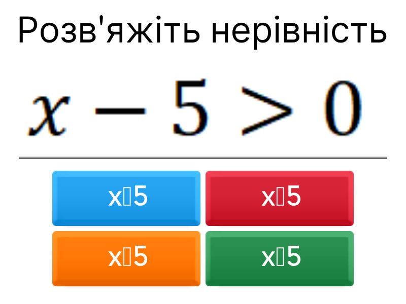 1) Розв'яжіть нерівність a) x≽5 b) x≺5 c) x≻5 d) x≼5 2) Розв'яжіть нерівність a) x≽-7 b) x≺-7 c) x≻7 d) x≼7 3) Розв'яжіть нерівність a) x≽3 b) x≺2,5 c) x≻3,5 d) x≼2,5 4) Розв'яжіть нерівність a) x≽-5 b) x≺5 c) x≻-5 d) x≼5 5) Розв'яжіть нерівність a) x≽-4 b) x≺4 c) x≻4 d) x≼-4 6) Розв'яжіть нерівність a) x≽0 b) x≺0,5 c) x≻0 d) x≼0,5 7) Розв'яжіть нерівність a) x≽3 b) x≺15 c) x≻3 d) x≼5 8) Розв'яжіть нерівність a) x≽2 b) x≺-2 c) x≻-2 d) x≼2