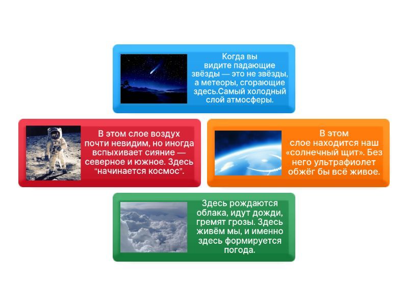 Здесь рождаются облака, идут дожди, гремят грозы. Здесь живём мы, и именно здесь формируется погода. - Тропосфера — “Погодные специалисты”, В этом слое находится наш «солнечный щит». Без него ультрафиолет обжёг бы всё живое. - Стратосфера — “Озоновые защитники”, Когда вы видите падающие звёзды — это не звёзды, а метеоры, сгорающие здесь.Самый холодный слой атмосферы. - Мезосфера — “Метеорные ловцы”, В этом слое воздух почти невидим, но иногда вспыхивает сияние — северное и южное. Здесь “начинается космос”. - Термосфера — “Космические разведчики”,