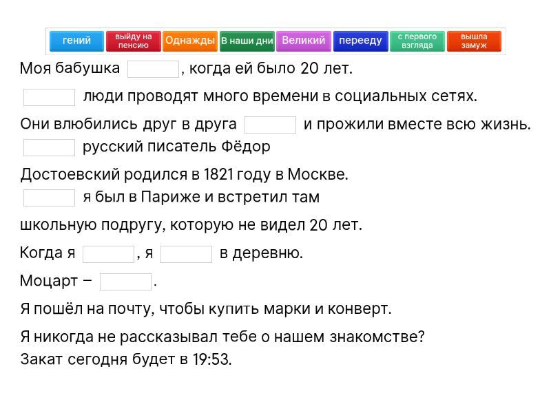Моя бабушка ____, когда ей было 20 лет. ____ люди проводят много времени в социальных сетях. Они влюбились друг в друга ____ и прожили вместе всю жизнь. ____ русский писатель Фёдор Достоевский родился в 1821 году в Москве. ____ я был в Париже и встретил там школьную подругу, которую не видел 20 лет. Когда я ____, я ____ в деревню. Моцарт – ____. Я пошёл на почту, чтобы купить марки и конверт. Я никогда не рассказывал тебе о нашем знакомстве? Закат сегодня будет в 19:53.