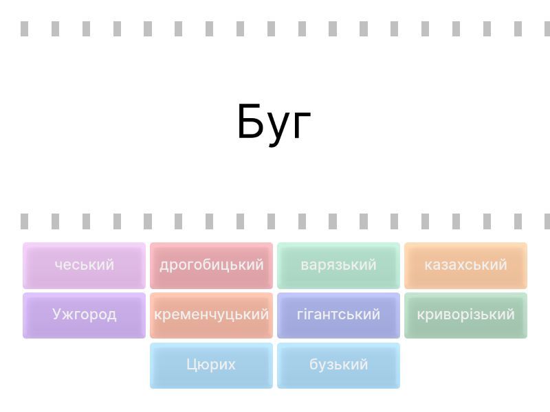 бузький - Буг, дрогобицький - Дрогобич, казахський - казах, криворізький - Кривий Ріг, чеський - чех, гігантський - гігант, варязький - варяг, кременчуцький - Кременчук, Ужгород - ужгородський, Цюрих - цюрихський,