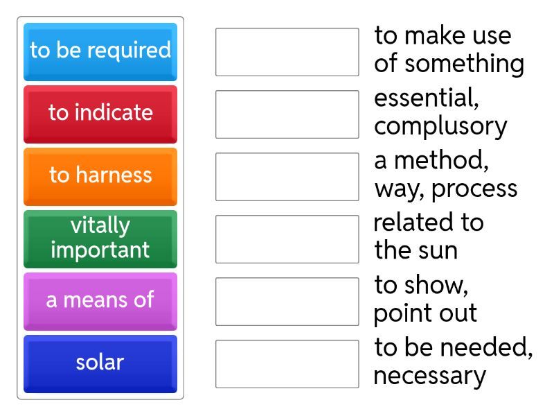 a means of - a method, way, process, to harness - to make use of something, solar - related to the sun, turbine - device to convert air, water, steam into energy, to be required - to be needed, necessary, accurately - exactly, correctly, to determine - to measure, work out, calculate, to indicate - to show, point out, vitally important - essential, complusory, audited - checked, reviewed, examined, strategy - a plan,