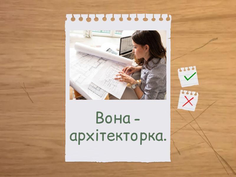 Пані Анна - лікарка. - Пані Анна працює лікаркою., Вона - вчителька. - Вона працює вчителькою., Він - актор. - Він працює актором., Моя сестра - програмістка. - Моя сестра працює програмісткою., Марта - дизайнерка. - Марта працює дизайнеркою., Мій брат - водій. - Мій брат працює водієм. , Ця дівчина - художниця. - Ця дівчина працює художницею., Він - кухар. - Він працює кухарем., Вона - архітекторка. - Вона працює архітекторкою., Вони - офіціанти. - Вони працюють офіціантами.,