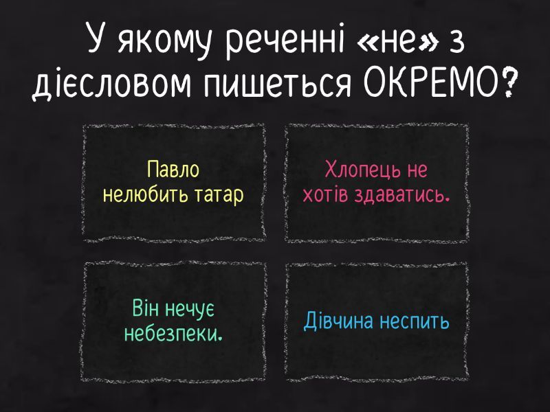 1) У якому реченні «не» з дієсловом пишеться ОКРЕМО? a) Павло нелюбить татар b) Хлопець не хотів здаватись. c) Він нечує небезпеки. d) Дівчина неспить 2) Де записано дієслово в УМОВНОМУ способі? a) Павлусь шукає сестру. b) Ганусю вкрали. c) Татари продавали б жінок та дівчат 3) Де є ОСОБОВЕ дієслово? a) Морозить у степу. b) Я побіжу до козаків. c) Почути голос. d) Вечоріє і темніє. 4) Де дієслово ДОКОНАНОГО виду? a) Шукають b) Знайти c) Знаходь d) ходив би 5) Де дієслово в УМОВНОМУ способі a) Я б урятував сестру! b) Він урятує її. c) Рятуй швидше! d) Він рятував її. 6) Де НАКАЗОВИЙ спосіб? a) Я слухаю Петра. b) Він не спить. c) Слухай, брате! d) Він слухав уважно. 7) У якому рядку «не» з дієсловом пишеться ОКРЕМО? a) не/хтувати b) не/знати c) не/встигати d) не/дочувати 8) Де є дієслово ДІЙСНОГО способу? a) скачуть b) бігайте c) танцювали б d) бійтеся
